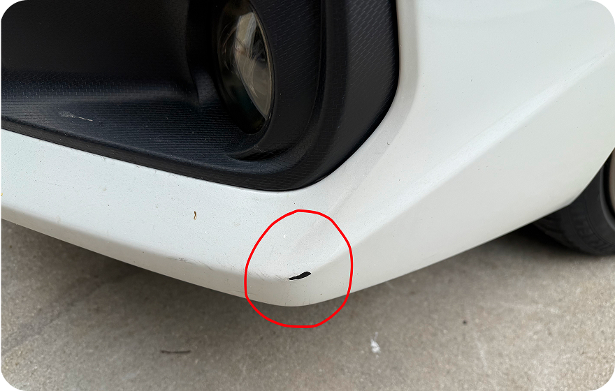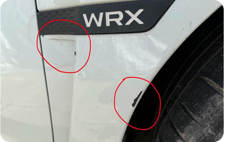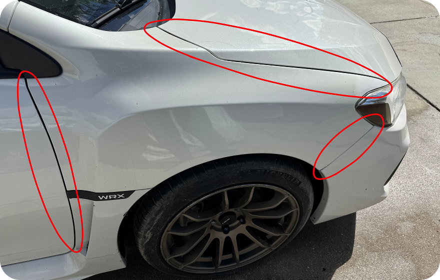 The vehicle has a lot of minor scratches and some areas where the paint appears that it has flaked off or was scraped off. This includes both left and right fenders and front bumper.